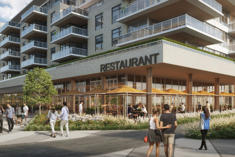 Within the community, there is an interplay between each of its distinct commercial areas to create a well-rounded neighbourhood. As the primary entrance to North Harbour, Fell Avenue represents the heart of the community. The Shops at North Harbour overflow with patio spaces, cafes and retail, all adding detail to the streetscape through materiality, signage, canopies, lighting and outdoor seating.
